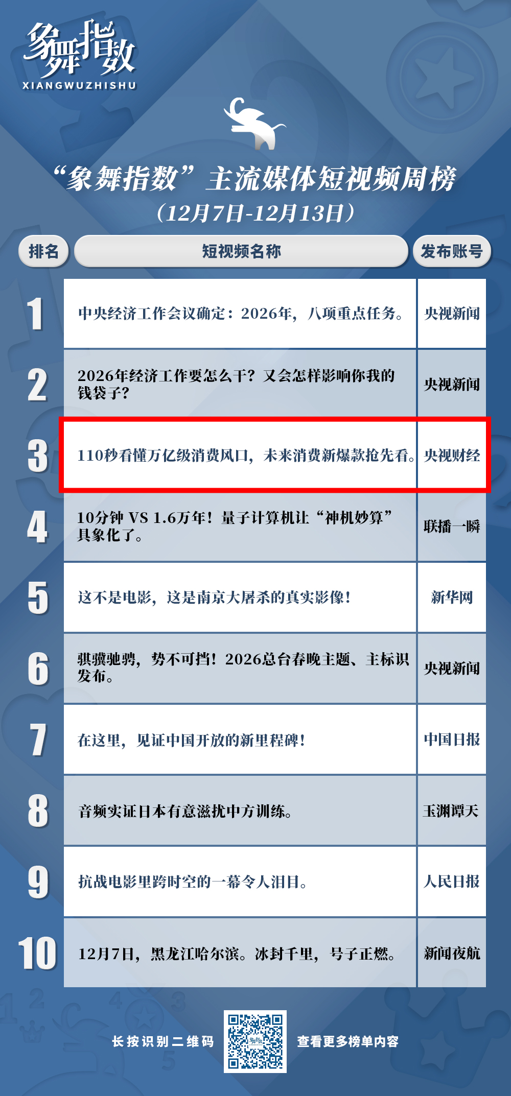 “央视财经”发布的短视频《110秒看懂万亿级消费风口,未来消费新爆款抢先看。#财经那些事儿》敏锐地抓住部分省份试点推行“雪假”引爆冰雪经济这一新热点,并以此为引子,把工信部等六部门发布的《关于增强消费品供需适配性进一步促进消费的实施方案》解释得清楚明白。