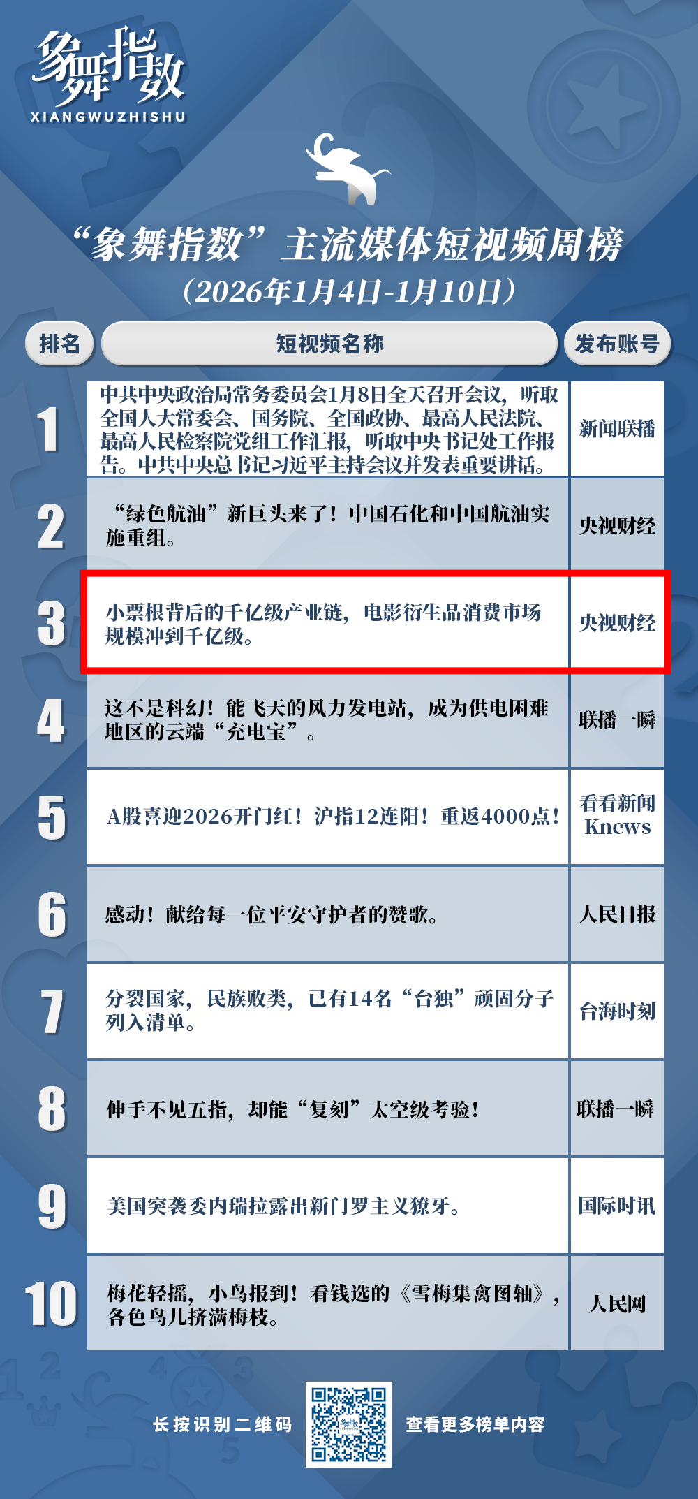 视频围绕“小票根”依次展开消费提振、产业升级与技术革新三个分支,每个分支均以“数据+案例”支撑,将抽象的产业数据转化为具象场景,使观众在短时间内快速了解核心要点。该视频充分利用短视频视觉优势,以字幕突出关键数据与核心观点,用网言网语拉近与受众的距离,配合旁白通俗解读,实现了“听觉+视觉”双重信息强化,结尾还以春节档电影的开放式提问引导互动。用户热评:“电影票根变经济引擎,绝了!”
