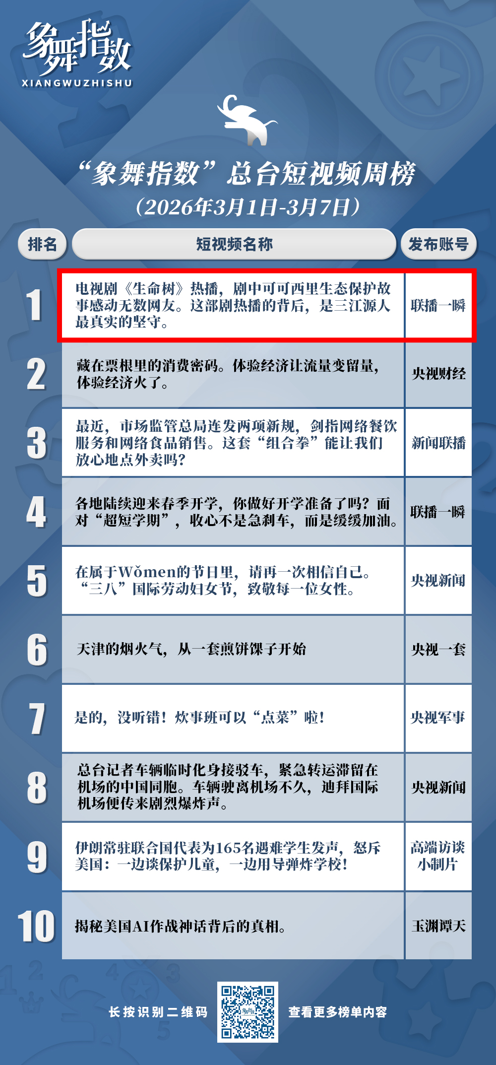 短视频《电视剧<生命树>热播,剧中可可西里生态保护故事感动无数网友。这部剧热播的背后,是三江源人最真实的坚守》精准选取剧中主要人物的高燃台词,穿插美如画的可可西里自然实景与三江源守护者的工作纪实,三者有机结合、虚实交织,使“剧中故事”与“现实坚守”相呼应,兼具真实感与厚重感,清晰传递出守护生态、致敬奉献的主流价值观。借助电视剧热点之“势”,实现短视频高价值传播,准确将长剧、短视频优势结合,达到了内容价值传播的目标。